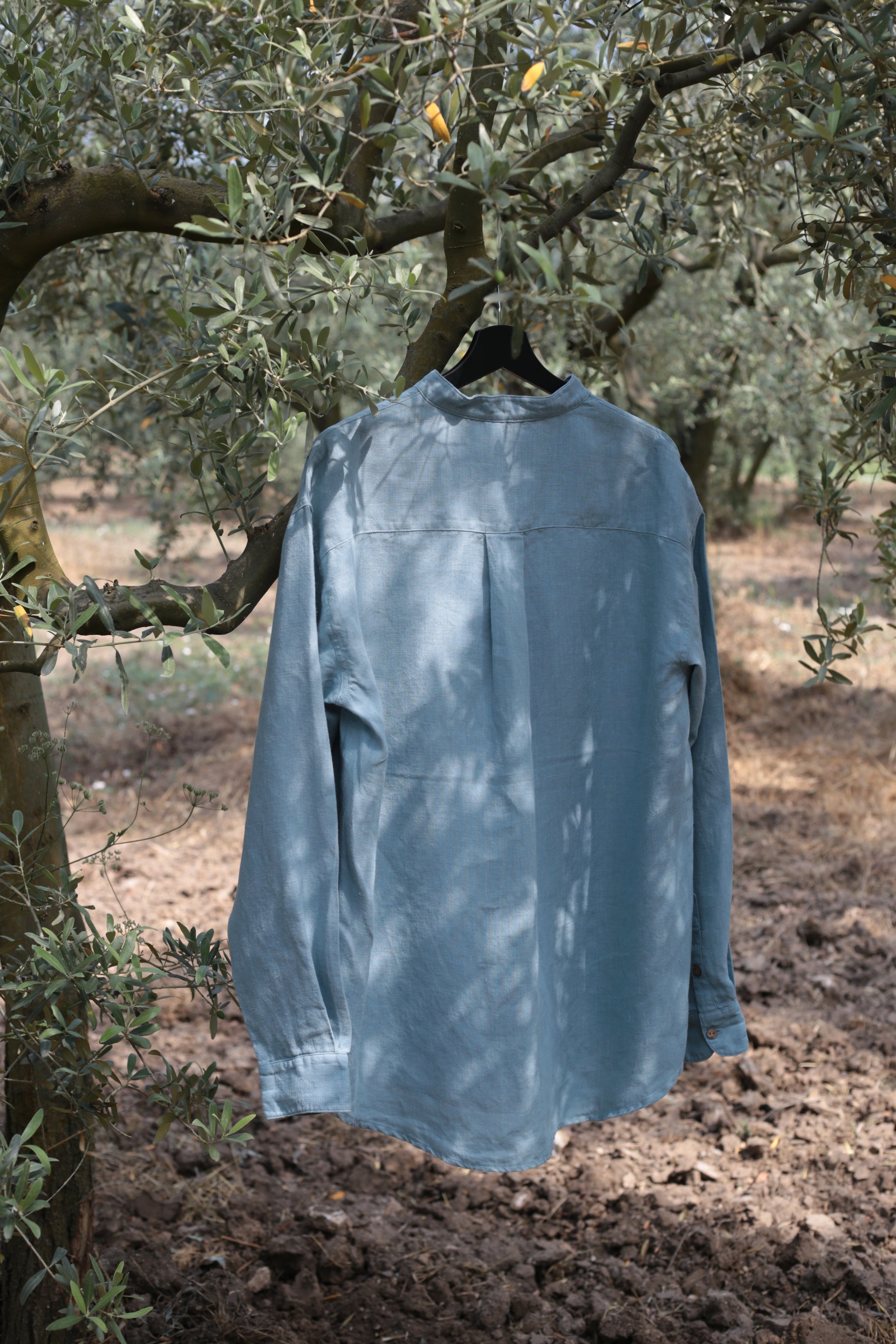 Traveller Linen shirt for men with stand collar in Aquamarine Blue