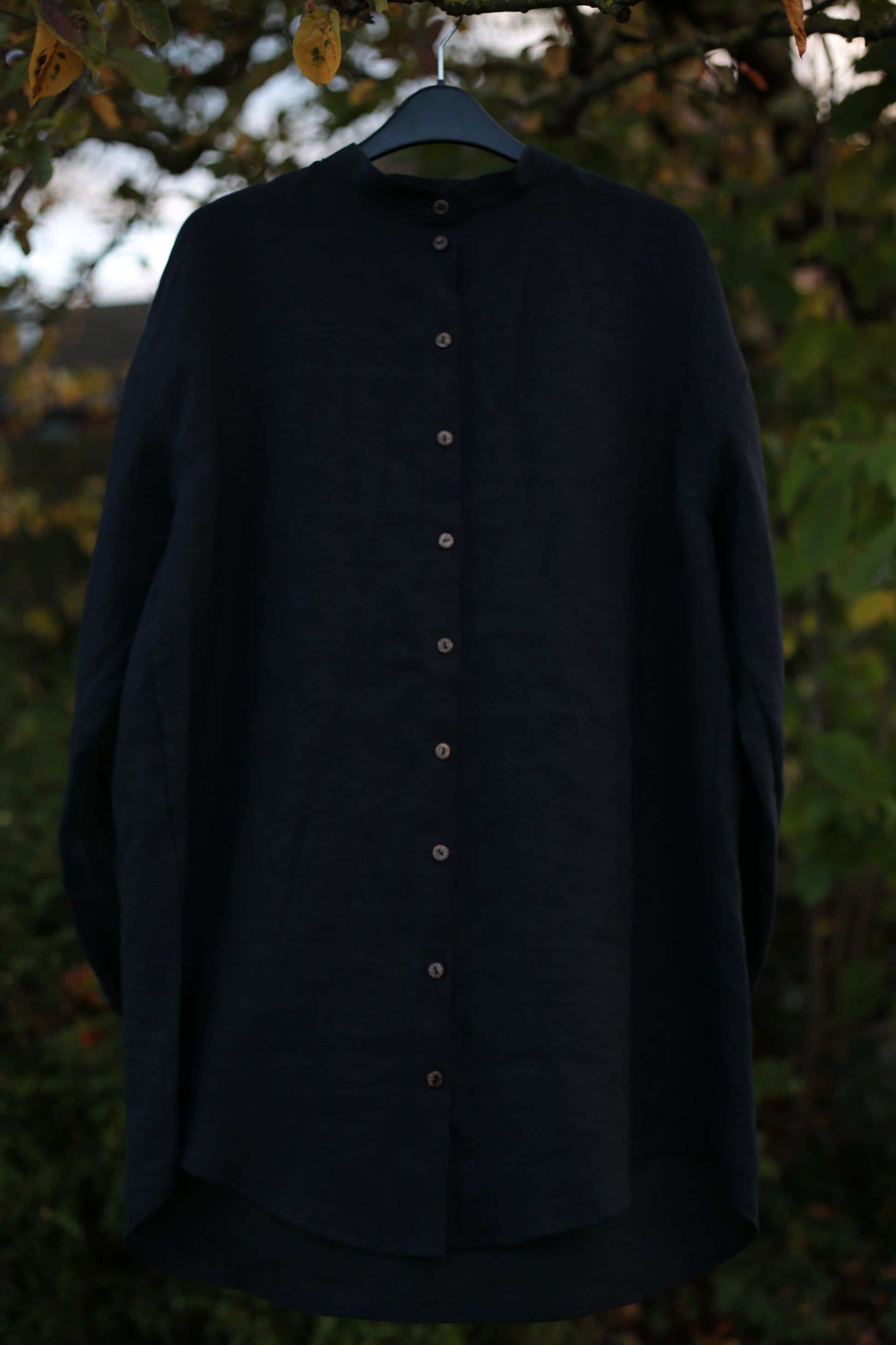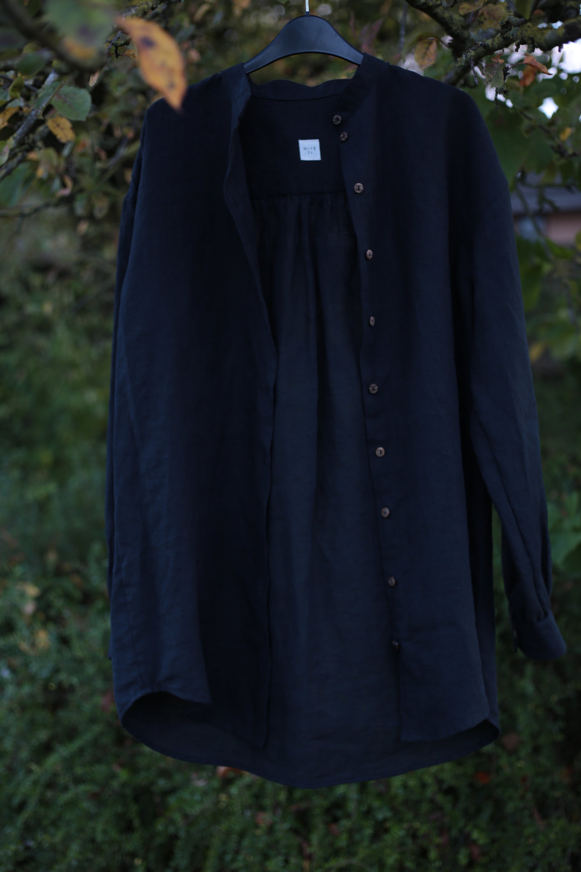 Gorgeous, medium-weight Black linen for all-year-round wear. Loose fit with romantic gathering on sleeves and back. I use natural coconut buttons here.