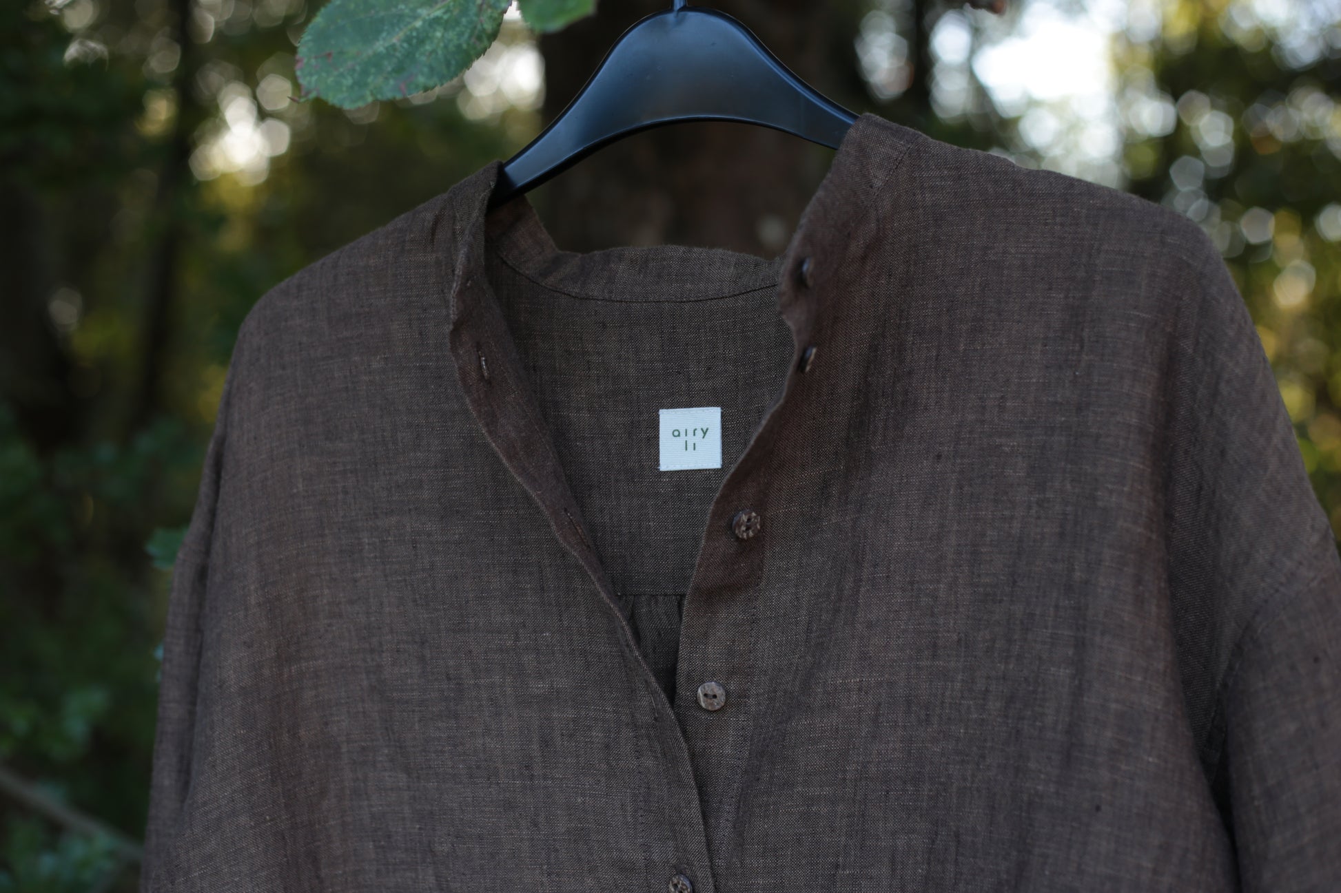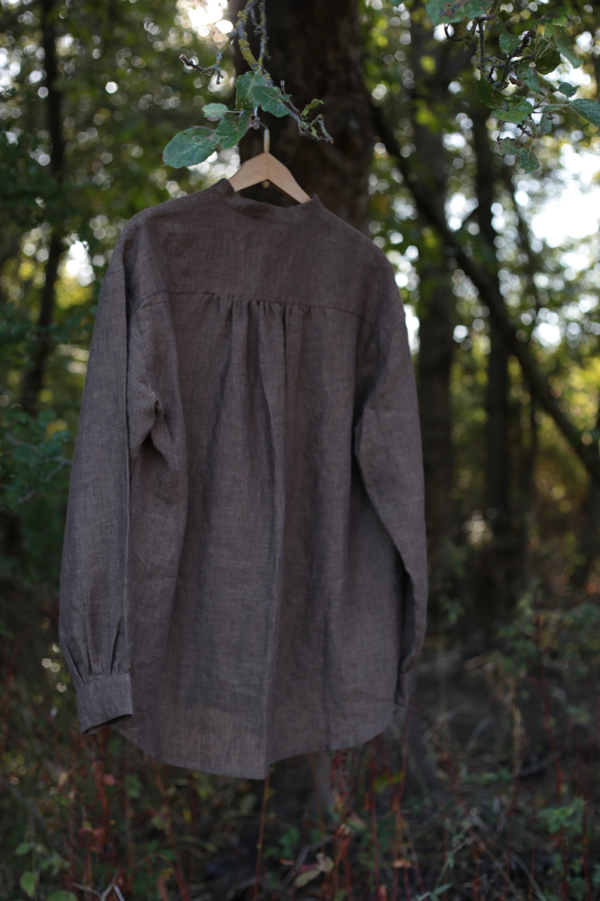 Cozy and warm, this Chestnut Brown linen features a silk-like touch and is easy to style. Loose fit with romantic gathering on sleeves and back. Don't forget natural coconut buttons, looking soooo nice with it!